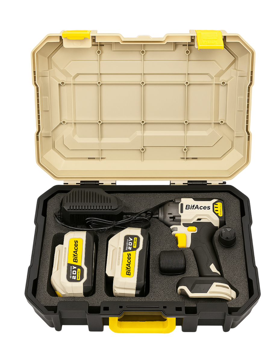 дарный аккумуляторный гайковерт BifAces DLIW-40-500A с батареей Li-Ion 20 В ёмкостью 3,0 А·ч (аккумуляторная платформа Makita) и бесщеточным двигателем, развивает крутящий момент до 500 Н·м, имеет регулировку скорости, где максимальная скорость вращения до 2550 об/мин с частотой до 3500 уд/мин.