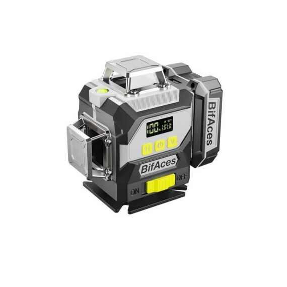 Аккумуляторный мультипризменный лазерный уровень BifAces DTL-16-Р с аккумулятором Li-Ion емкостью 3,9 А·ч, с напряжением 4,2 В имеет 16 лучей, резьбовое соединение под штатив 1/4″ и проецирует 2 взаимно перпендикулярные линии с охватом в 360° на расстояние до 40 м при помощи зеленых лучей длиной 515 НМ. Точность составляет ±0,3 мм/м. Уровень используется для построения разметки во время проведения отделочных и строительных работ. Уровень способен выполнять 3 режима работы: Горизонталь + вертикаль, Отвес (плюмб), Наклонные линии, оснащен функцией автоматического самовыравнивания по времени до 5 сек.